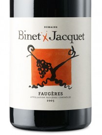 Les vins du domaine Binet-Jacquet sont des vins de terroir, marqués par leur caractère, leur minéralité et leur élégance. Nous avons sélectionné leur première cuvée qui se nomme simplement Faugères, millésime 2008, issue des quatre cépages cités ci-dessus, élevée un an en cuve.