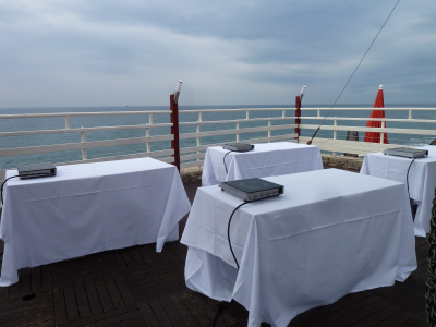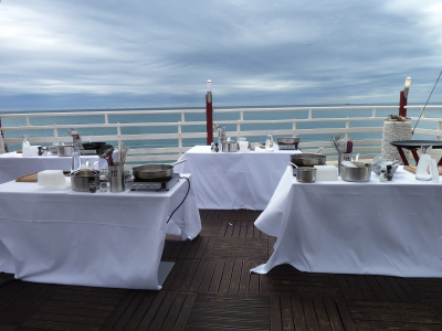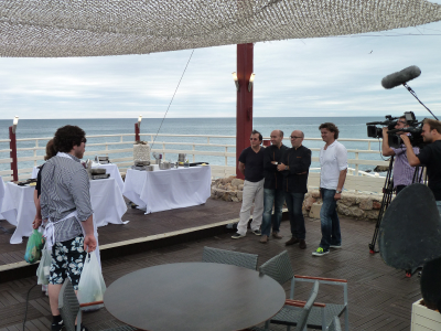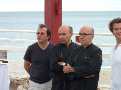 Une fois installés les 4 postes de travail sur la terrasse du restaurant, dos à la mer, jury et chefs contrôlent le fonctionnement du matériel pendant que les 4 candidats sont partis aux Halles de Sète faire les achats d’ingrédients dont ils auront besoin pour réaliser leur plat. Deux produits ont été choisis et imposés par les frères Pourcel aux candidats, des rougets de roche et des courgettes en fleur. Autant dire que la cuisine méditerranéenne sera au programme des épreuves.
