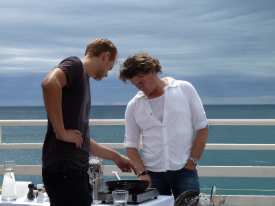 Joris un des chefs des équipes des frères Pourcel travaillant dans les cuisines du Jardin des Sens à Montpellier, originaire de Hollande, qui est en charge de suivre le déroulement des épreuves et son organisation logistique. Ci-dessus avec Alain Caron un des membres de l’équipe de l’émission et jury du concours.