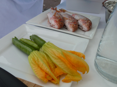 Fleurs de courgettes farcies de fenouil et de riz de Camargue, filets de rougets grillés, sauce à l’orange. Un beau plat, avec beaucoup de goût et une belle cuisson de rouget.