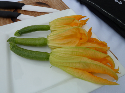 Tempura de fleur farcie, fricassée de courgettes aux olives, citrons confits et rougets grillés. Présentation plutôt décevante, mais une belle cuisine du soleil, la sauce tomate était excellente, de même que les légumes. Dommage la cuisson du rouget était vraiment loupée.