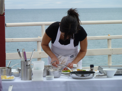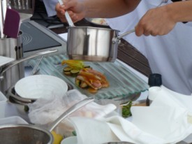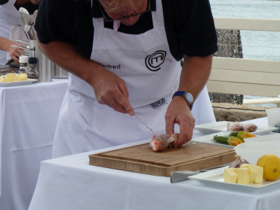 Courgettes en fleurs et rougets de roche au programme du concours MasterChef sur la terrasse du restaurant L’AmeriKclub à Sète, ce dimanche après-midi, où les quatre candidats restant dans la course s’activaient pour réaliser leur plat en une heure. Ils retrouvent les 4 membres du jury, Peter Lute, Alain Caron