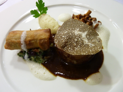poêlée de girolles, quelques blettes et jus de veau à la truffe blanche.