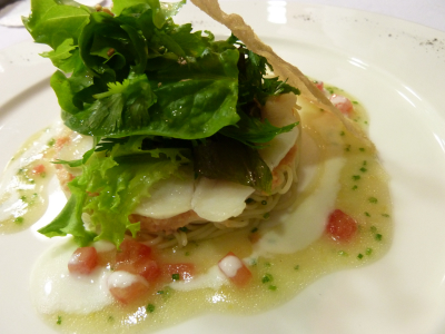 Sur une salade de capelini et marmelade de crustacés, fine escalope de loup mi-cuit,