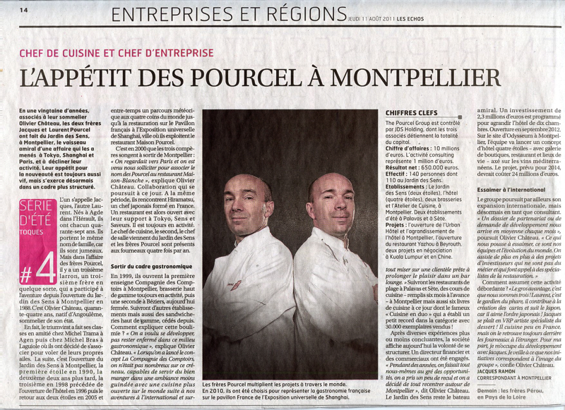 C’est en 2000 que les trois compères songent à sortir de Montpellier : « On regardait vers Paris et on est venu nous solliciter pour associer le nom des Pourcel au restaurant Maison-Blanche », explique Olivier Château. Collaboration qui se poursuit à ce jour. A la même période, ils rencontrent Hiramatsu, un chef japonais formé en France. Un restaurant est alors ouvert avec leur support à Tokyo, Sens et Saveurs. Il est toujours en activité. Le chef de cuisine, le second, le chef de salle viennent du Jardin des Sens et les frères Pourcel sont présents aux fourneaux quatre fois par an.