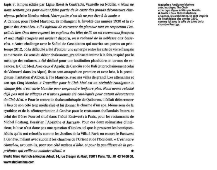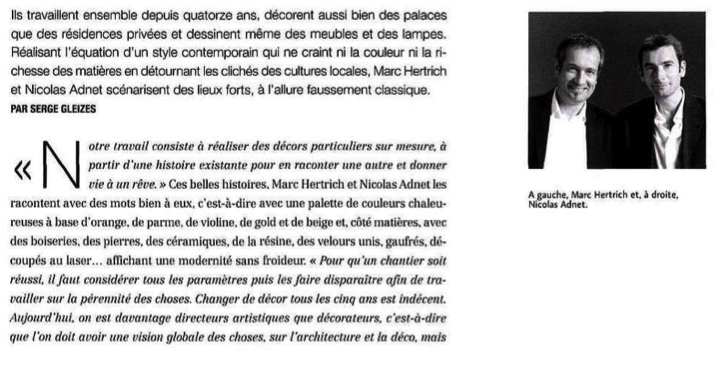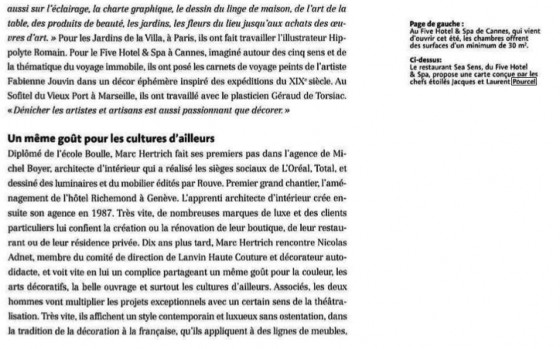Le magazine IDEAT du mois de septembre 2011 consacre trois pages aux architectes d’intérieur Nicolas Adnet et Marc Hertrich, qui ont réalisé entre autres, le – Five Hôtel & Spa – à Cannes où vous pouvez découvrir depuis le mois de juin dernier le restaurant SeaSens… Article ci-dessous à lire sans modération, et même plus ! Procurez-vous ce numéro et vous découvrirez ainsi la nouvelle formule du magazine.