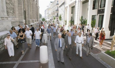 Fanfare swingante. Rivières de petits fours. Discours municipaux. L’inauguration de la métamorphose du cœur de Cannes ne pouvait échapper à personne hier en fin d’après-midi. Coincé entre les prestigieuses Croisette et rue d’Antibes, le quartier qui comprend les rues Notre-Dame, Bivouac-Napoléon, des Belges et Buttura a désormais un visage urbain contemporain et attractif. Disparues les rangées de voitures en stationnement et les petits trottoirs qui obligeaient au gymkhana. Aujourd’hui, des orangers, de jolies barrières en ferronnerie, de vastes trottoirs pavés et aérés offrent un décor de 6 200 m2 propice à la déambulation piétonne. Et à la consommation !