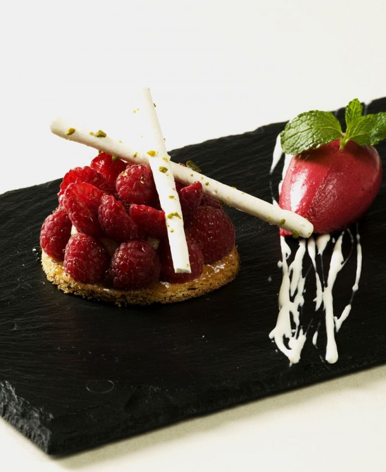 Versez un peu de crème pour coller le sablé à l’assiette. Garnissez la tartelette de crème vanillée puis disposez les framboises fraîches. Croisez deux bâtonnets de meringue sur le dessus et accompagnez d’un sorbet à la framboise.