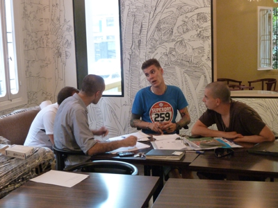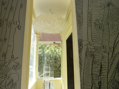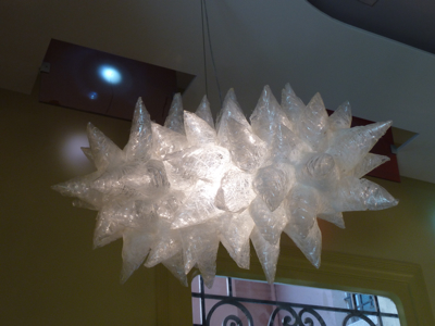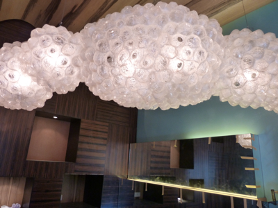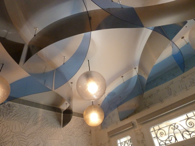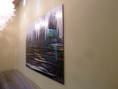 Pose des premières oeuvres originales aux murs ( ci-dessus ), de belles pièces uniques vous attendent déjà, passionnés d’art contemporain l’ensemble des associés ont apporté beaucoup de soins au choix des oeuvres. Vous pourrez d’ailleurs découvrir dans le restaurant une table unique par sa forme, son aspect et sa texture, nous la nommons déjà » la table loukoum « , sa particularité : elle est molle …. une vraie création chinée aux puces en France !