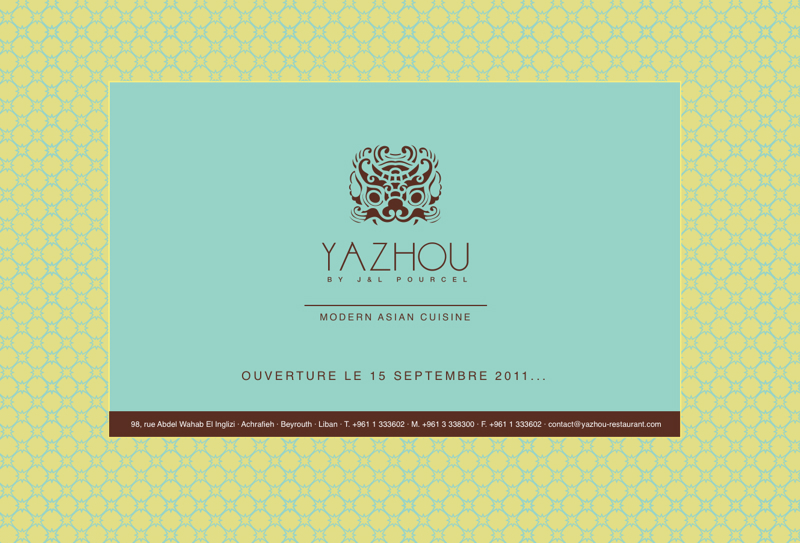» Yazhou » est né d’une rencontre, de l’envie de créer un lieu différent partagée par le propriétaire du seul Relais & Châteaux de Beyrouth » L’Albergo » M. Nammour et du trio Montpellierains. Partant du principe que les Libanais sont des nomades, de grands voyageurs, ils ont eu envie de développer un restaurant d’esprit totalement Asiatique, la traduction de Yazhou en Chinois veux dire Asie… donc tout est dit, la cuisine sera asiatique mais relevée d’une touche française et personnelle des chefs Pourcel. La décoration a été confiée à un designer français Philippe Castrocastejon qui réalisent et habillent des appartements et des maisons luxueuses dans le monde entier et notamment à Beyrouth où il oeuvre déjà beaucoup.
