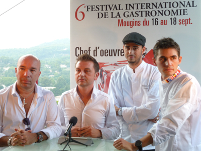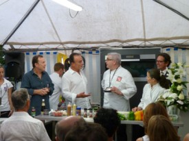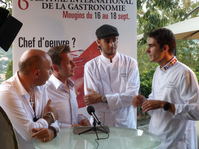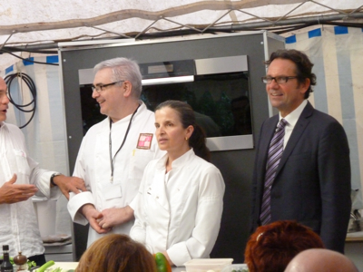 Au fil des heures, les chefs se succèdent et les animations s’activent, le ministre du tourisme Frédéric Lefèvre fait le tour des stands où les chefs cuisinent. Ici, avec le chef Francis Cardaillac qui sera par cette occasion fait citoyen d’honneur de la ville de Mougins.