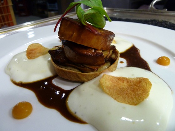 foie gras de canard poêlé, espuma de pomme de terre des sables et jus de rôti.