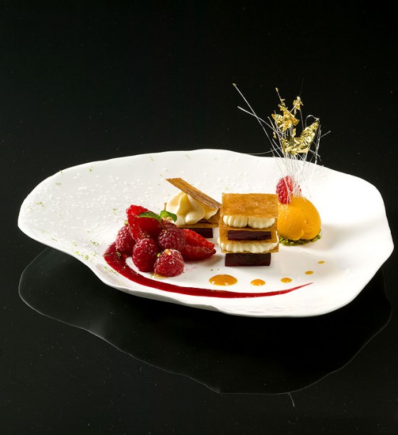 Montez chaque mille-feuille au dernier moment en intercalant les croustillants de couches de crème légère et la gelée de framboise. Renouvelez l’opération une seconde fois. Disposez les mille-feuilles sur des assiettes bien froides, décorez de quelques framboises fraîches et d’un trait de coulis. Accompagnez l’ensemble d’une quenelle de sorbet à la mangue ou à l’abricot.