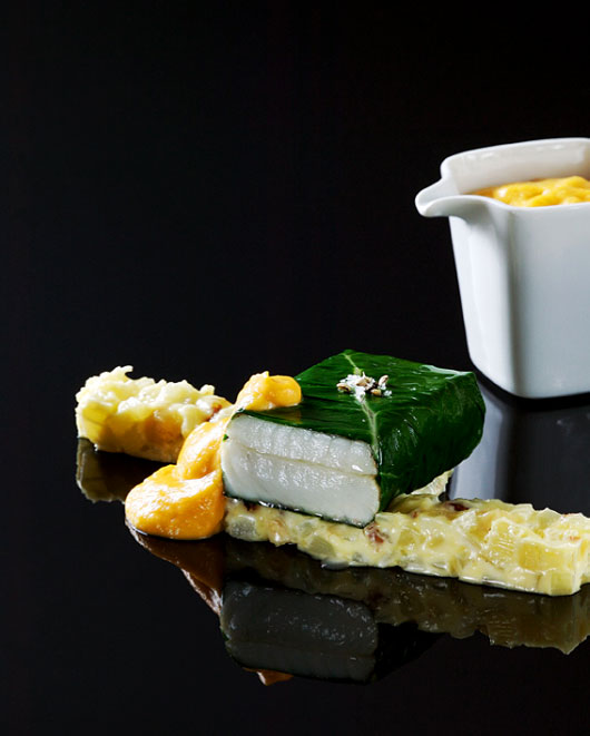 Enfournez les pavés de loup au four à 120 °C (th. 4) pendant 15 minutes. Disposez une cuillerée de fricassée de blette au centre de chaque assiette. Dressez le loup dessus, cernez d’un cordon d’écume de patates douces et décorez d’une bande de peau croustillante.