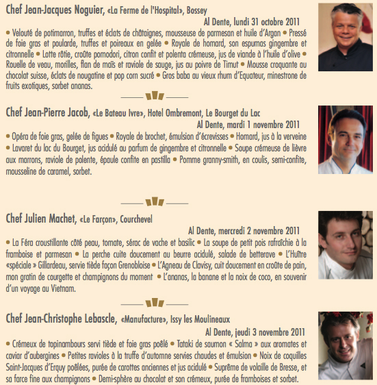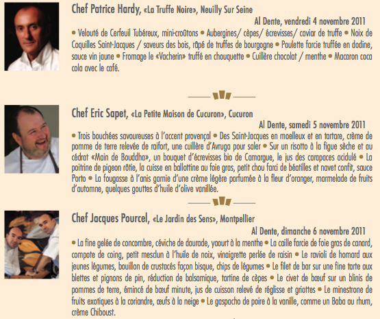 Vous retrouverez ci-dessous la liste des chefs et leurs menus, Ce sont Jacques & Laurent Pourcel qui clôtureront les festivités le dimanche 6 novembre en présence de Jacques Pourcel et de ses sous chefs.