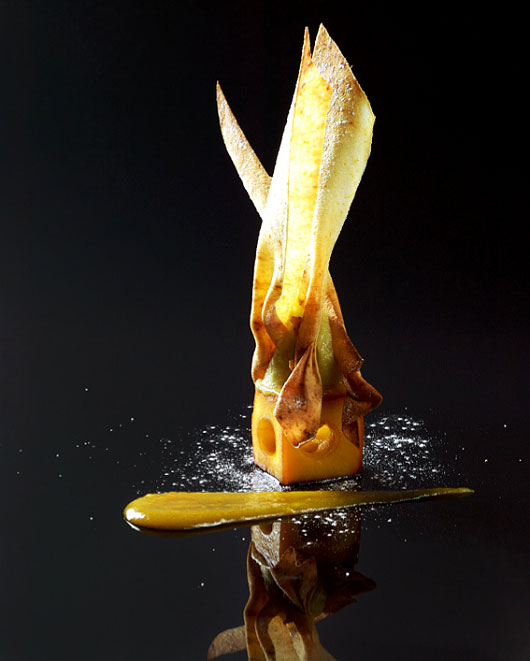 À l’aide d’un emporte-pièce de 1,5 cm de diamètre, videz les six côtés du cube pour ôter tout l’intérieur de la pomme. Réservez les parures. Confectionnez un sirop avec l’eau, 250 g de sucre et le jus de citron. Pochez les cubes pour que la chair soit tendre. Réalisez un caramel avec 100 g de sucre dans une poêle à revêtement antiadhésif. Roulez-y les cubes de pommes et réservez.