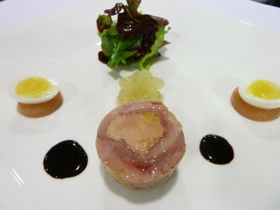 La caille farcie de foie gras de canard, compote de coing, petit mesclun à l’huile de noix, vinaigrette perlée de raisins.