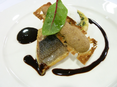 Le filet de bar sur une fine tarte aux blettes et pignons de pin, réduction de balsamique, tartine de cèpes.