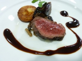 Le civet de bœuf sur un blinis de pommes de terre, émincé de bœuf minute, jus de cuisson relevé de réglisse et griottes.
