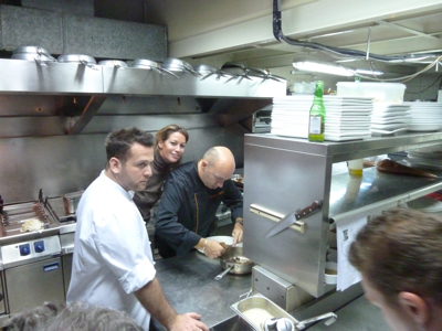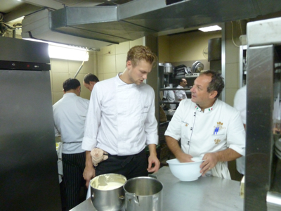 Benjamin Armstrong, chef exécutif dans le groupe Pourcel, en cuisine avec Olivier Château et Nicolas, le chef du Relais & Châteaux l’Albergo et son restaurant italien » Al Dente « .
