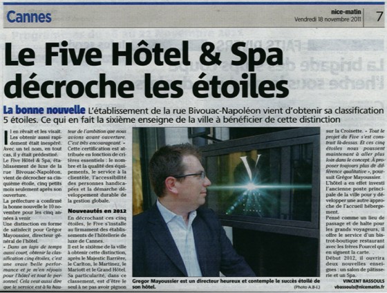 À bientôt six mois après l’ouverture, le Five Hôtel & Spa obtient une cinquième étoile dans le classement des hôtels haut de gamme de la Côte d’Azur, voilà chose faite. Ce qui ouvre la voix du Five Hôtel et du restaurant Sea Sens à une clientèle amatrice de beaux endroits et de table raffinée.