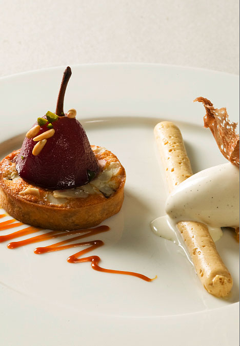 Disposez les poires au vin sur les tartelettes frangipane, collez les pignons et les pistaches avec un peu de vin épicé réduit. Dessinez un graffiti de sauce caramel et tirez un cordon de chantilly pralinée. Servez avec une glace à la vanille.