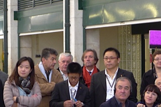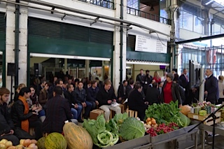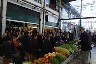 Tous se sont assis sur des cagettes de marché pour écouter les interventions d’institutionnels portugais et du journaliste Jean-Claude Narcy.
