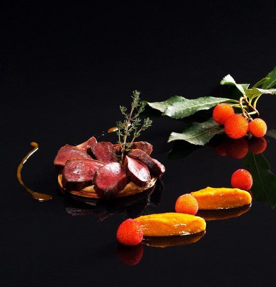 Dressez sur des assiettes une quenelle de compote d’arbouses. Posez à côté la tarte. Terminez avec la sauce griotte-réglisse.