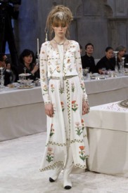 Les mannequins font leur apparition, tweed perlé, tuniques de soie, brocart, sari, étoles, des bijoux en pagaille, sur le front, les mains, les cheveux, les épaules ; amazones orientales, elles incarnent l’ultra raffinement d’une collection hommage aux Métiers d’Art et au savoir-faire des artisans.