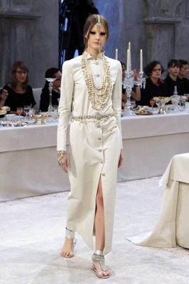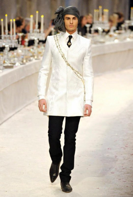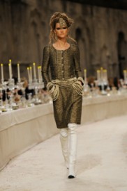 Cette collection Chanel, façonnée à la mode indienne, est entièrement dédiée aux métiers d’art. Karl Lagerfeld rendit ainsi hommage aux petites mains qui s’affairent dans les ateliers créant parures de broderie et pièces rares de joaillerie autour des costumes traditionnels de l’Inde. Saris dorés, drapés de cachemire, soies iridescentes, lainages rebrodés, bijoux aux perles précieuses.