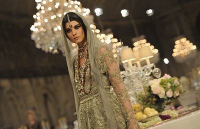 Le magistral banquet évoquant les fastes d’un palais de Maharadjah, emporta la collection Paris-Bombay dans une Inde exquise, envoûtante, chatoyante. Un songe poétique en rupture avec la monotonie automnale, les convives, prirent place le long de deux longues tables. Argenterie, cristallerie, cascade de desserts, fruits patinés à la feuille d’or, pétales de roses et des colliers de fleurs… thé aux épices, lassi à la mangue ou champagne… tel était le programme.