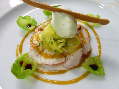 La salade de homard en rosace, fraicheur d’ananas et choux vert à la coriandre, vinaigrette au jus de passion, sorbet verveine.