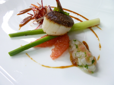 La noix de Saint- Jacques en croûte de pain d’épice, vinaigrette pamplemousse et poireaux.