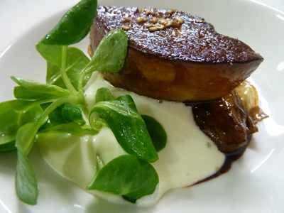 L’escalope de foie gras de canard poêlée, rattes aux échalotes confites, sirop de Banyuls, salade de mâche.