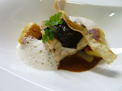 Le filet de loup au four, salsifis glacés, jus de rôti acidulé, truffe et gnocchis.