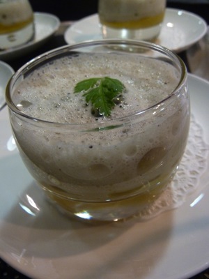 La fine purée de potimarron, émincé de truffes noires, noisettes éclatées, écume de truffe.