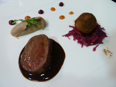 La noisette de chevreuil rôtie, crème de châtaignes, croquette de son civet, jus façon poivrade relevé de réglisse.