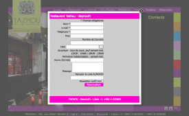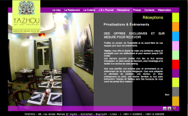 De la façade du restaurant, à sa salle principale, aux salons, au bar, chaque espace est présenté visuellement à travers un diaporama de photos, au fil des rubriques, sans oublier quelques suggestions de mets qui vous seront proposés à la carte.