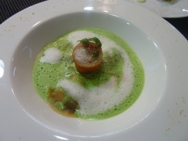 Les petites ravioles de confit de lapin au foie gras, poêlée de champignons de saison et noisettes de lapin, écume de bouillon de petits pois.