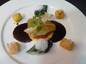 Le tronçon de lotte rôti, fine tarte feuilletée au confit de tomates, petits beignets de polenta au lard, roulé de blettes au parmesan, miroir de vin rouge.