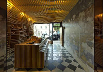 Ci-dessous la très originale boulangerie de Daniel Chirico, à Melbourne en Australie, très étonnante, mêlant codes anciens et design contemporain et bois clair.