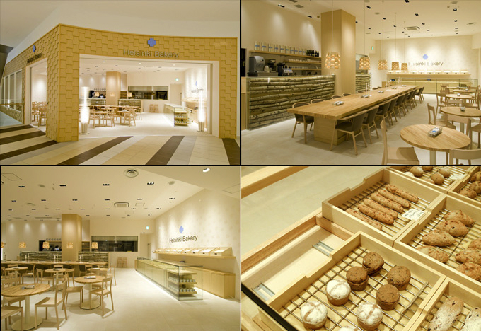 Ci-dessus, esprit totalement scandinave, bois clair et épurement pour cette boulangerie nommée » Helsinky » à Osaka au Japon.