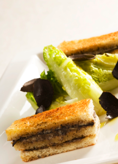 Club sandwich à la truffe et au comté, salade croquante à la fleur de sel