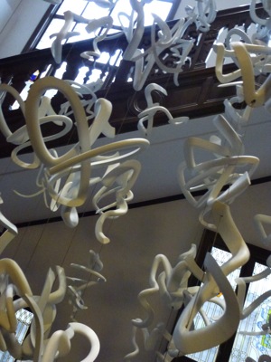 En montant l’escalier monumental et sombre, tout de bois sculpté, vous pourrez apprécier les nombreux vitraux totalement rénovés et surtout l’œuvre qui occupe toute la cage d’escalier faite d’idéogrammes chinois stylisés qui semblent totalement planer dans l’espace. (voir plus loin dans le post)