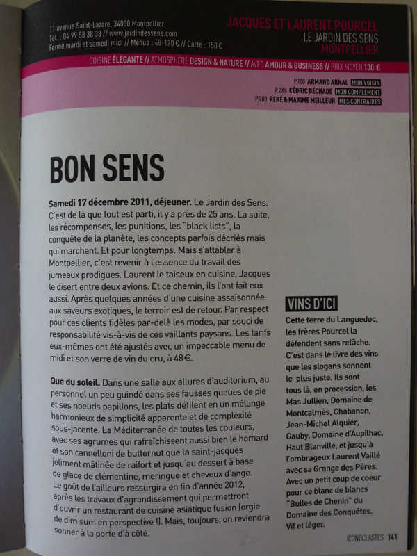 Le Jardin des Sens à Montpellier des frères Pourcel est classé dans les Iconoclastes, rien de plus qu’un » Bon Sens « … on vous laisse lire.