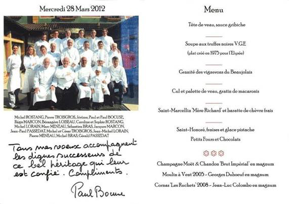 Et à Paul Bocuse de faire remarquer que tous ces chefs et leurs enfants qui ont choisis de vivre la cuisine comme leurs père étaient » les dignes successeurs de ce bel héritage qui leur est confié » …
