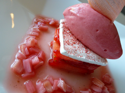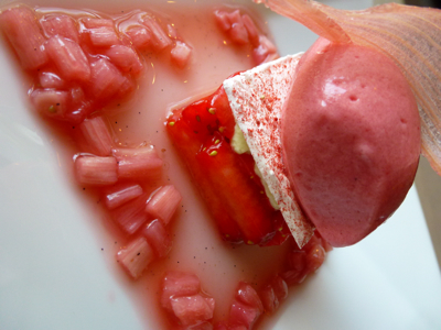 La fraîcheur de fraise gariguette et rhubarbe, meringue et sorbet fraise, sirop de rhubarbe infuse de verveine.