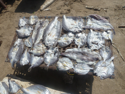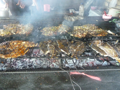 Une technique locale très particulière, les poissons sont ouverts en deux, mis à plat, nettoyés et vidés, et prêts directement à cuire sur le gril. La partie arêtes, cuite directement près de la braise, a tendance à griller et à presque disparaître. Ces poissons là sont aussi séchés au soleil, une technique de conservation que l’on retrouve dans beaucoup de pays en Asie.