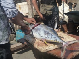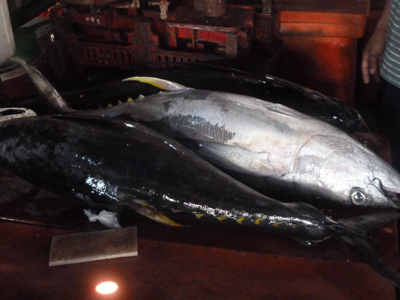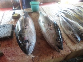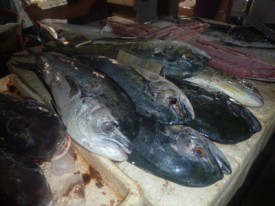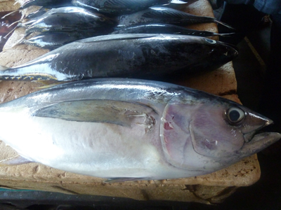 Les petits thons et les bonites tiennent une bonne place sur les étals. Ils sont souvent tranchés et mis en filets avant d’être vendus. Chair rouge ou chair blanche, c’est un des poissons le plus populaire sur les marchés. Il faut dire qu’il vaux moins d’un euros le kilos… alors pourquoi s’en priver ?