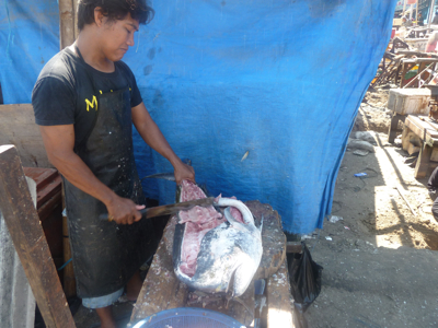 Des poissons aux têtes un peu bizarre sont mis en pièce, il faut dire qu’ici les catégories et les espèces de poissons n’ont rien à voir avec ceux de Méditerranée. Vous trouverez des poissons lune appelés mola-mola, le barramundi, le snapper, le gindara, le tongkol, le mahi-mahi, les calamars…